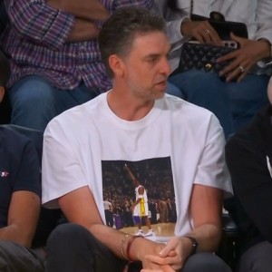 4月8日讯 今日NBA常规赛,湖人主场迎战雷霆。湖人名宿大加索尔来到现场观战,身上穿着一件印有科比81分庆祝动作的T恤。...