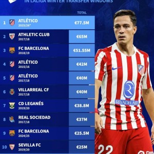05 03月 2026 69 德转列西甲历史冬窗转会收入榜:本赛季马竞7750万欧元第1 北京时间1月17日,德转列出了西甲冬窗出售球员的历史收入榜,今年冬窗连续出售加拉格尔(4000万欧元)、拉斯帕多里(22... 西甲