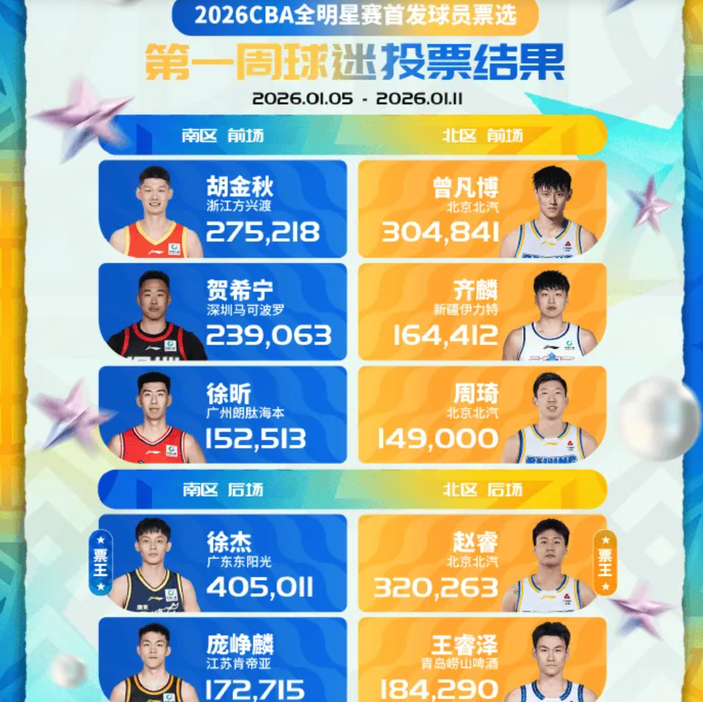 北区的票王,是来自北京队的后场悍将赵睿,他的票数为320,263,赵睿在去年夏天加盟北京队,这也是让他收获很多北京队球迷的支持,当然了,赵睿能够成为北区的票王,也离不开广东队球迷的支持。不过,赵睿的票数来看,想要超过徐杰,似乎有一些难度,毕竟,徐杰领先的票数达到了8万票。